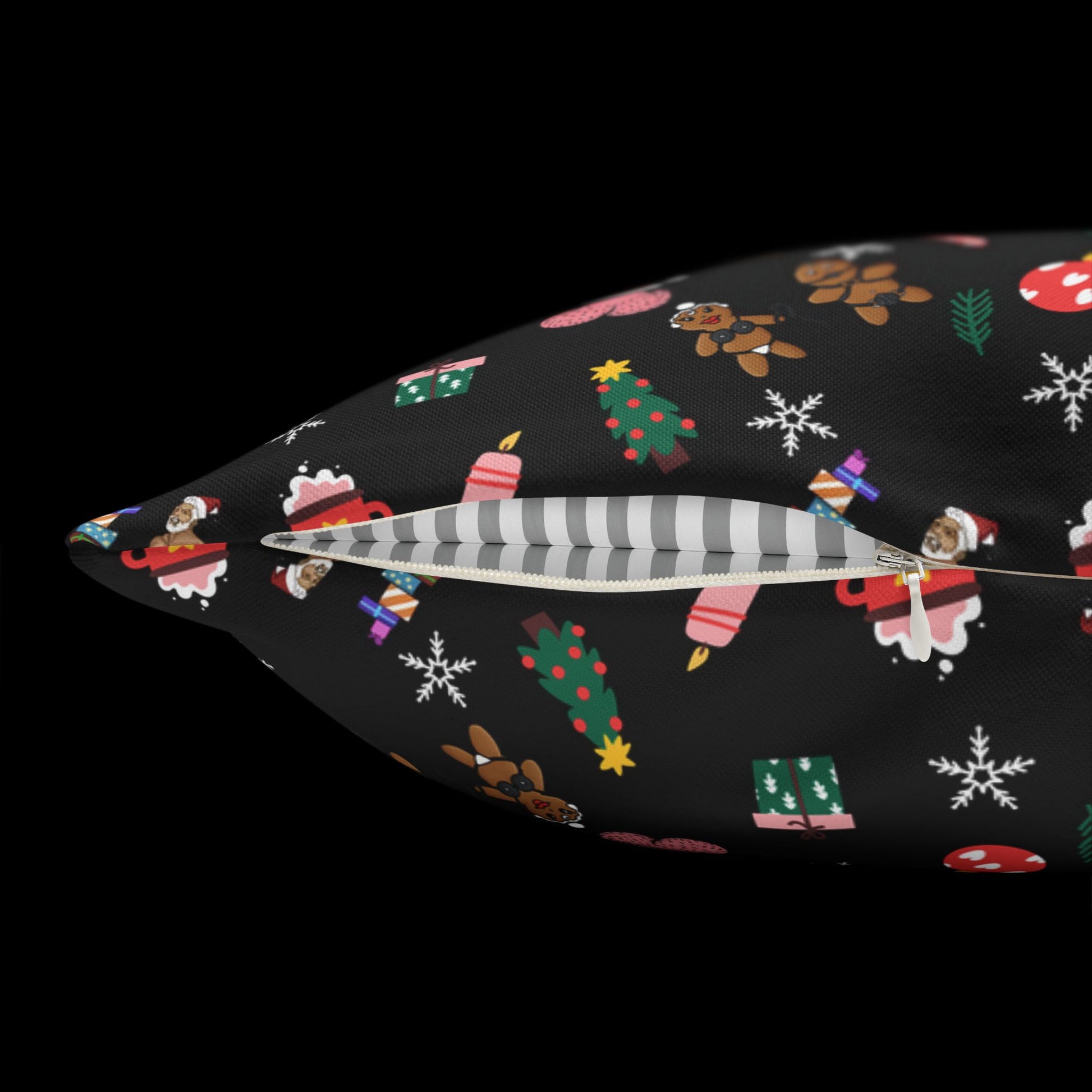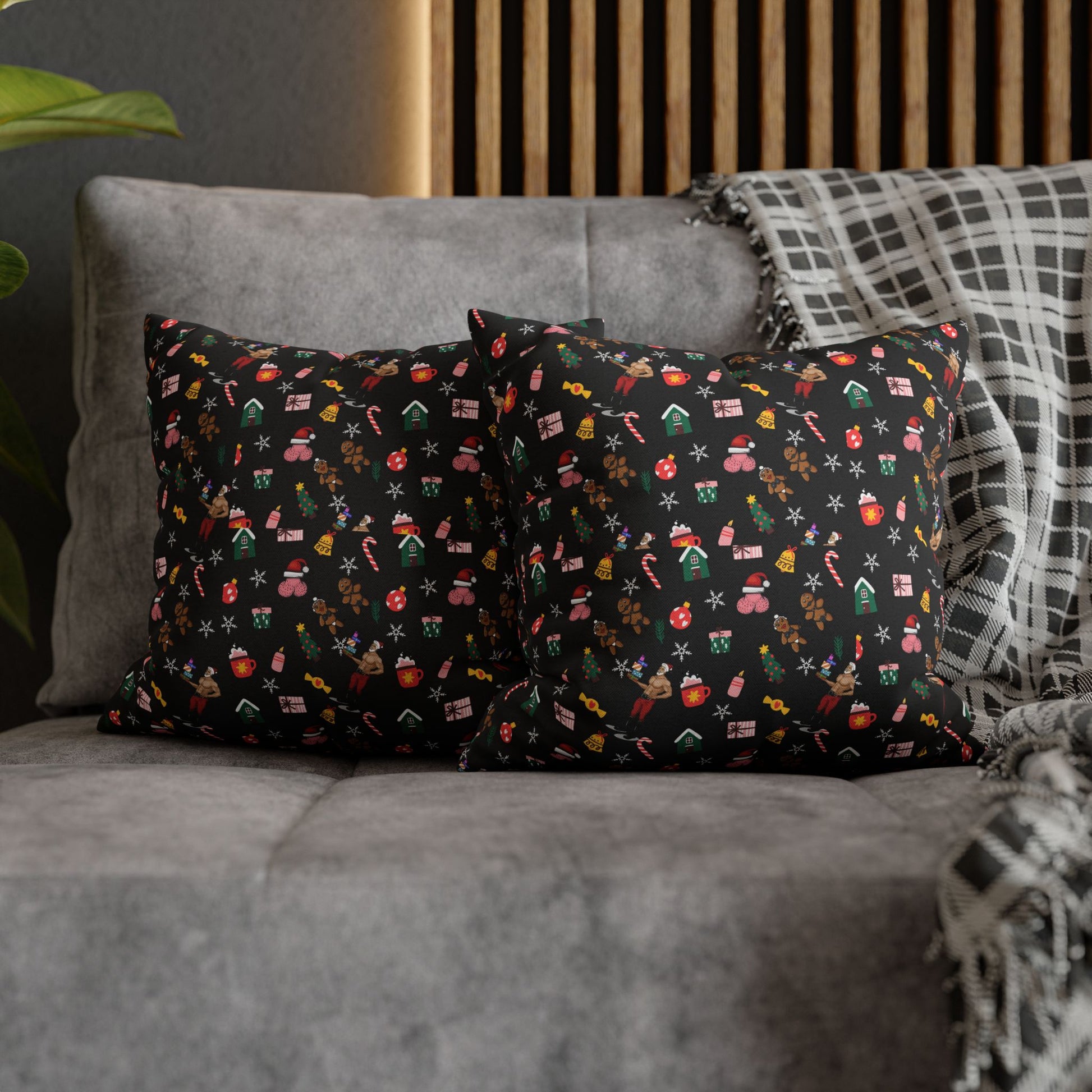 Meet your new favorite way to get cozy… and maybe a little wicked. Our Snuggle & Sin pillow cover wraps your space in soft, snuggly polyester while tossing tiny festive icons ball sacks, candy canes, gifts, stockings, and snowflakes across a sultry black background like holiday confetti with attitude. Perfect for lounging, spiking your hot cocoa, or getting a little cheeky under the tree, this pillow cover brings playful warmth and a hint of mischief wherever it lands.